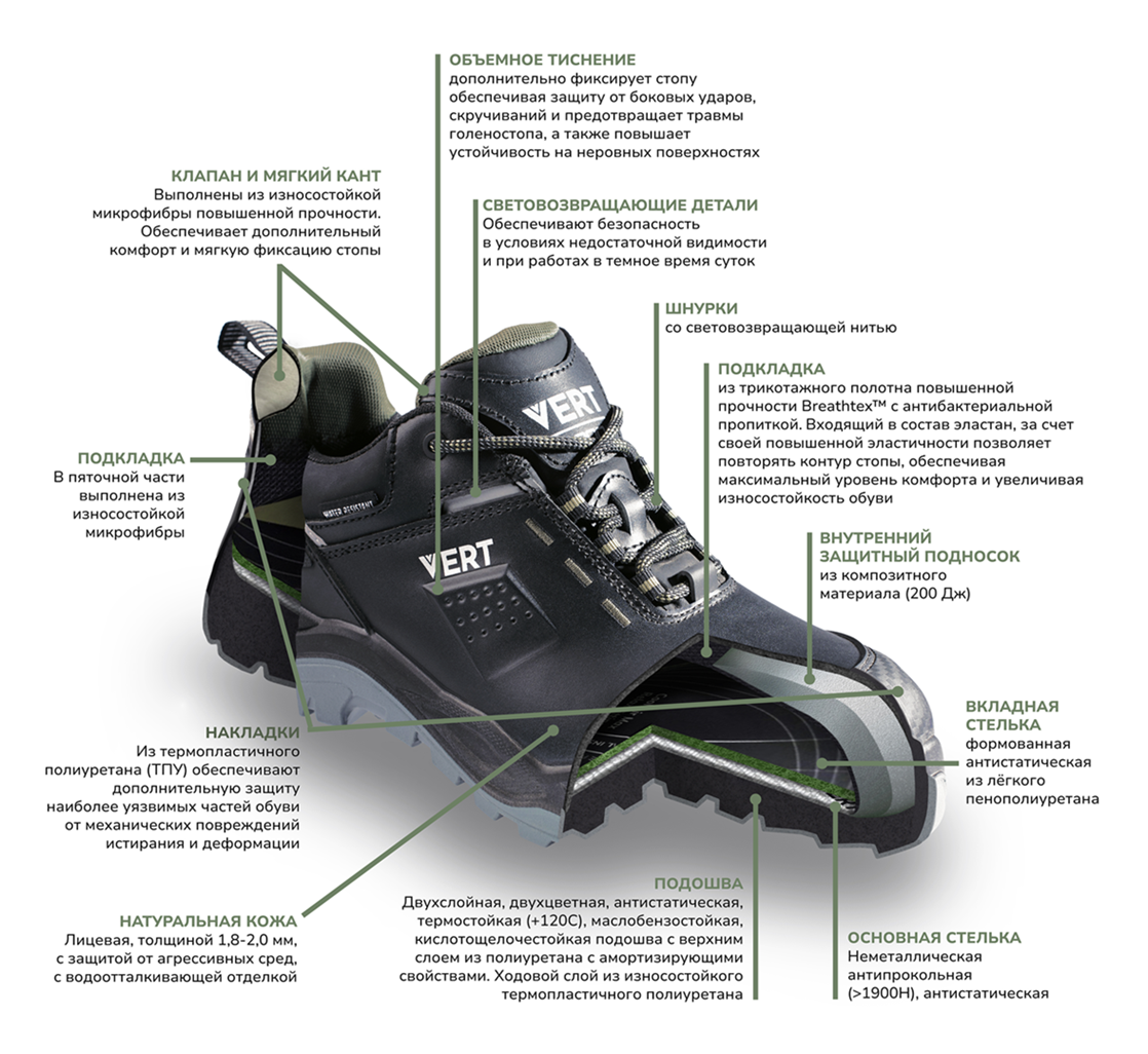Обувь серии VERT 3000 — безупречное сочетание стиля, комфорта и современных технологий! Коллекция отличается стильным дизайном, использованием высококачественных современных материалов и уникальной колодкой повышенного комфорта. Анатомическая стелька помогает минимизировать утомляемость и обеспечивает отличную поддержку стопы даже при длительной носке. Обувь серии VERT 3000 гарантирует надежную защиту от агрессивных сред и механических воздействий, что делает ее идеальным выбором для работы в самых разных отраслях промышленности. Высокие стандарты качества и технологичные решения обеспечивают безопасность и комфорт в любых условиях. VERT — защита и стиль без компромиссов!