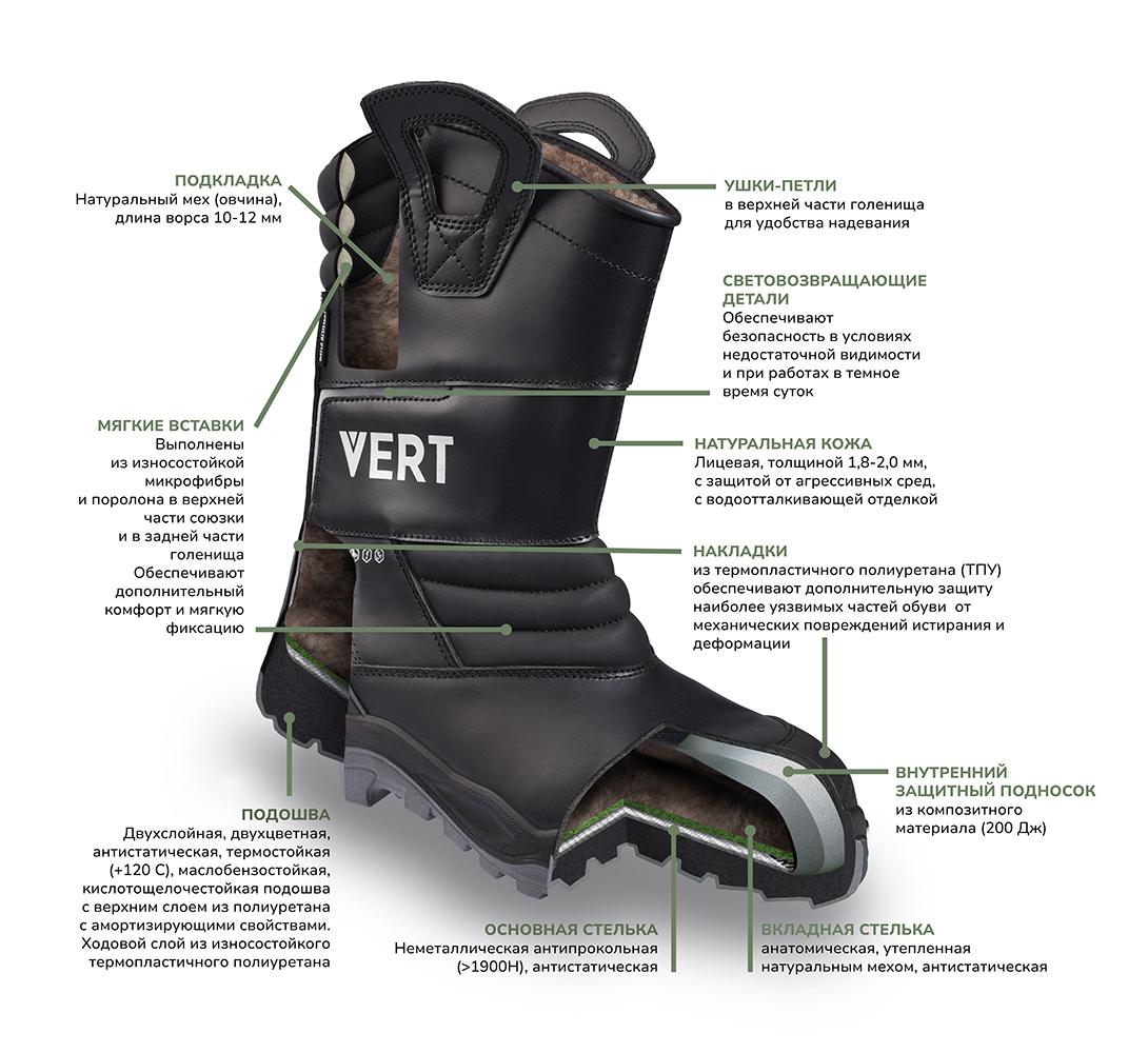 -Подошва: двухслойная ПУ/ТПУ, КЩС, МБС, термостойкая (до +120°С), морозостойкая (до -40 °С).
