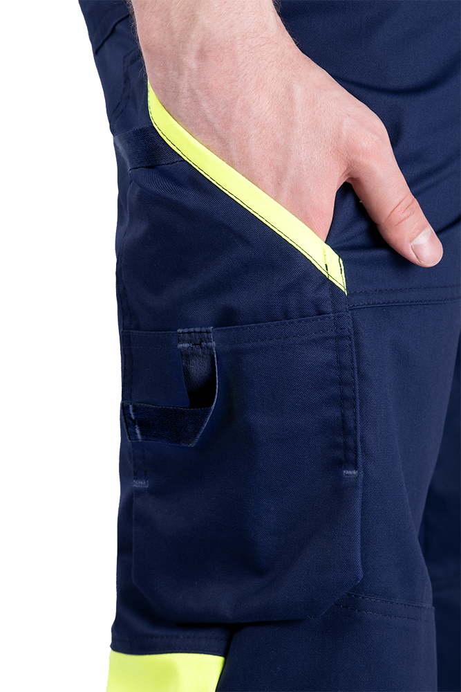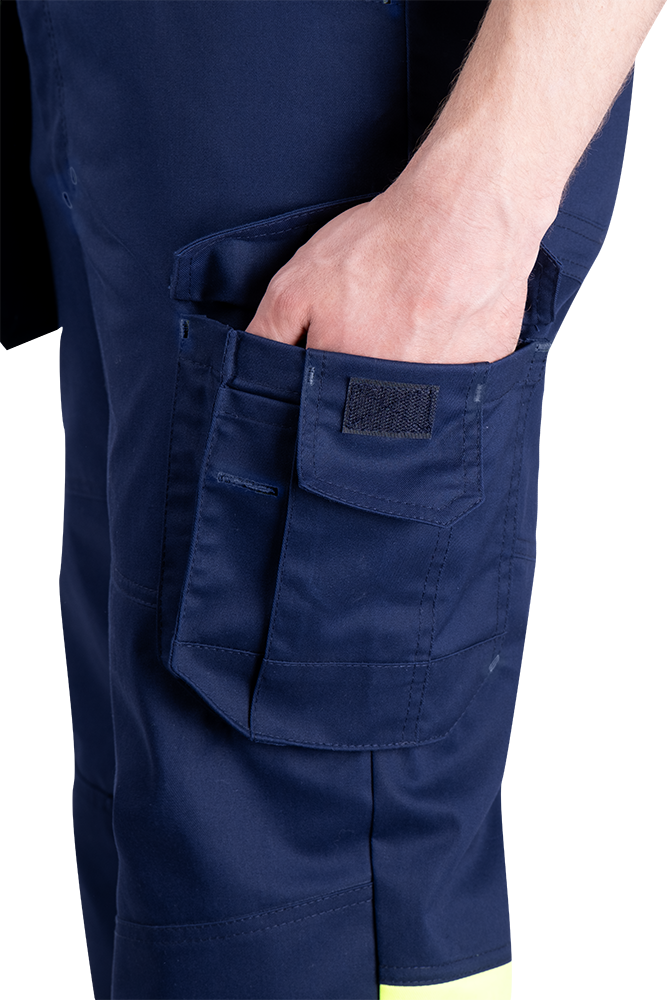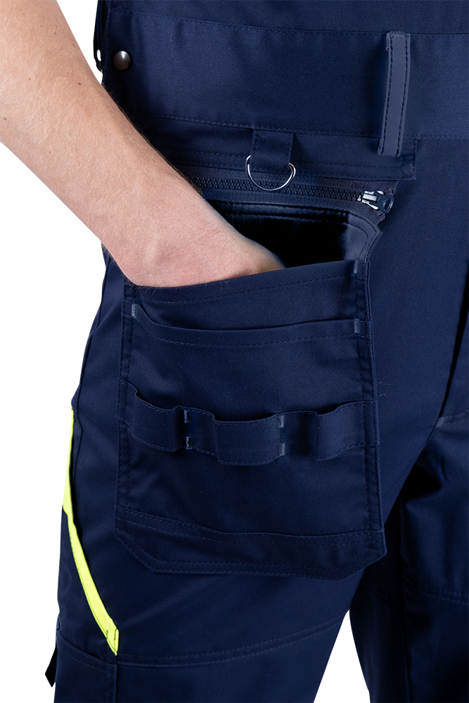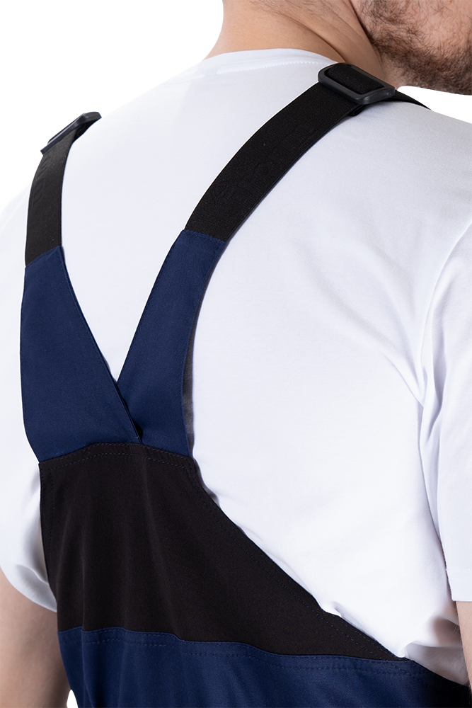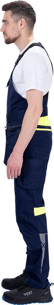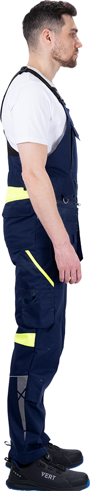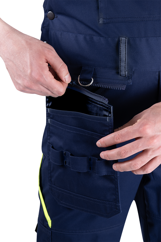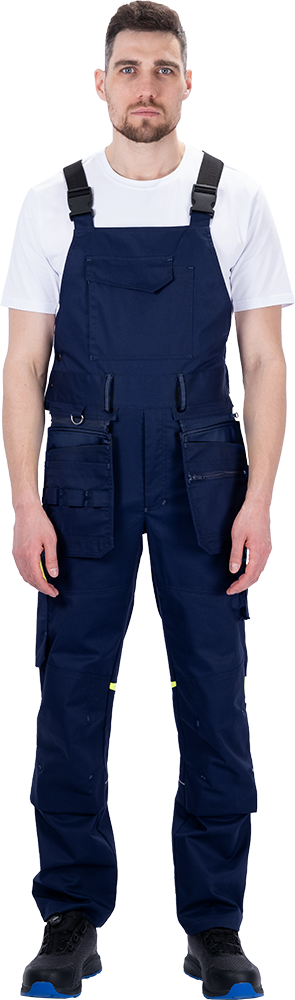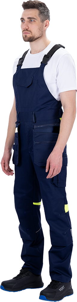 Дополнительный объёмный нагрудный карман и большое количество удобных карманов по бокам позволяют всегда держать под рукой необходимые инструменты и личные вещи. Усиленные наколенники с возможностью установки амортизационных вкладок делают полукомбинезон оптимальным для работы в коленоположении.