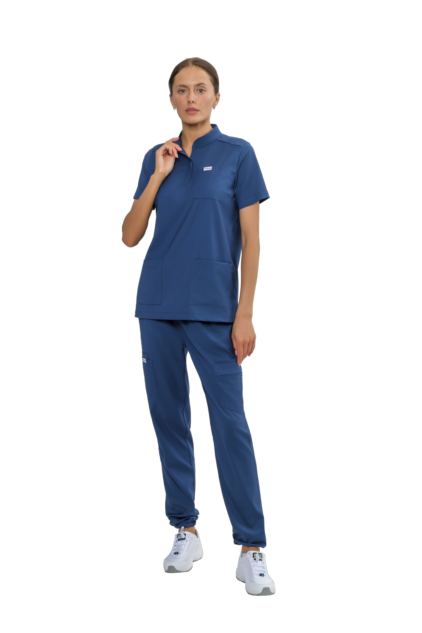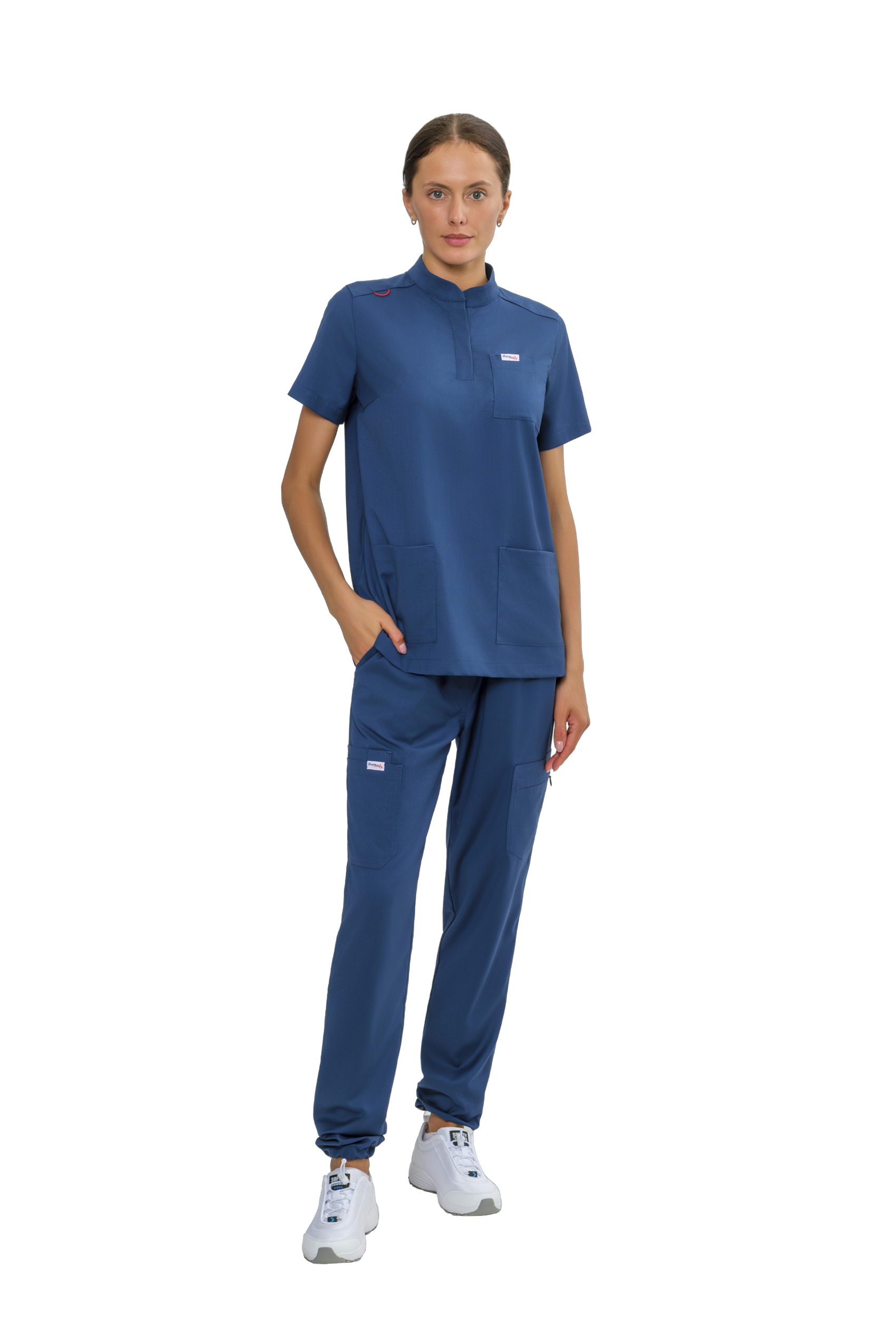 На уровне боковых швов расположены 3 накладных кармана: левый -накладной карман фигурной формы вход в карман с застежкой-молния, правый -большой накладной карман фигурной формы  и малый накладной карман расположен под правым большим карманом, вход в карман разделенный на две секции.